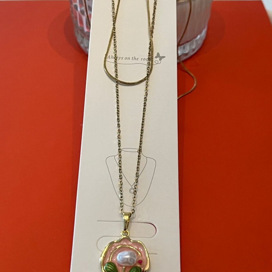 Pembe mineli çiçekli kolye